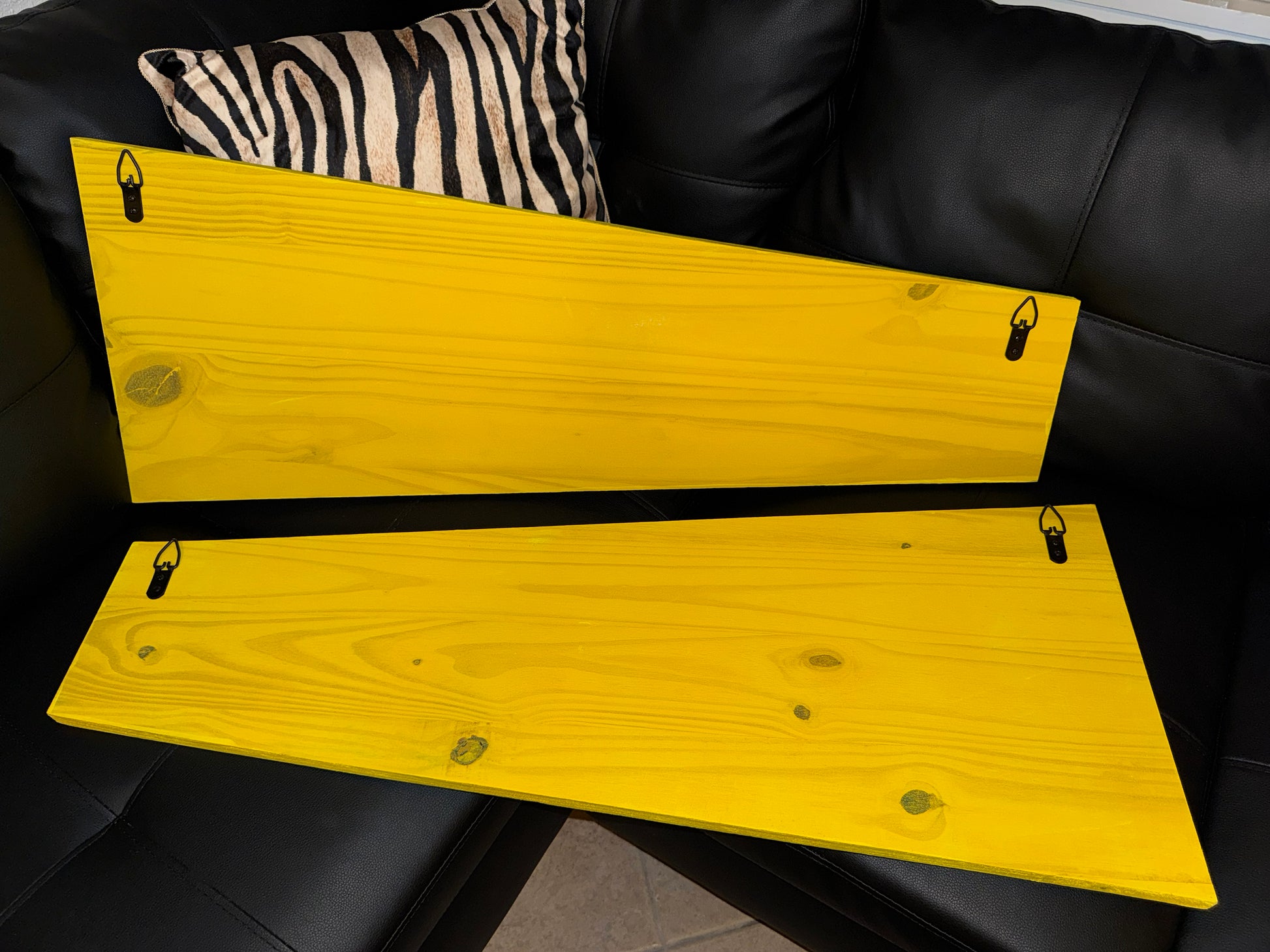 These are handmade by me from Reliabilt 3/4" thick S4S spruce, pine & fir edge-glued softwood boards with UV responsive paints. They're 36" long by 14" tall at the tall part of the sign and 7" tall at the shorter end. Comes with two mounting hangers screwed into the back of each sign and your choice of hardware for either drywall/wood or concrete installation.
